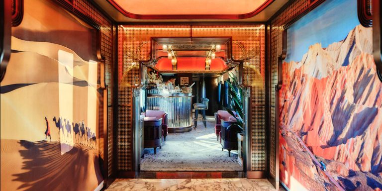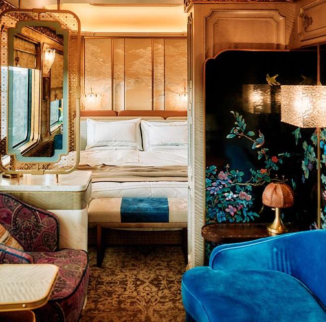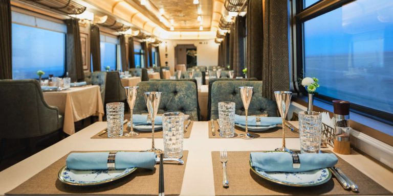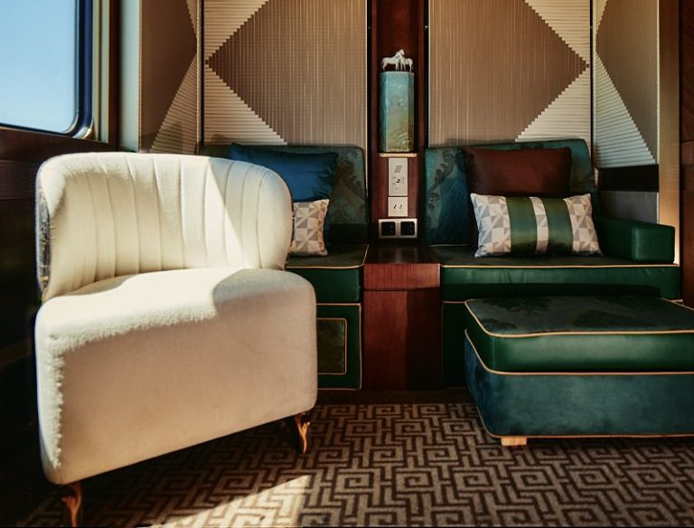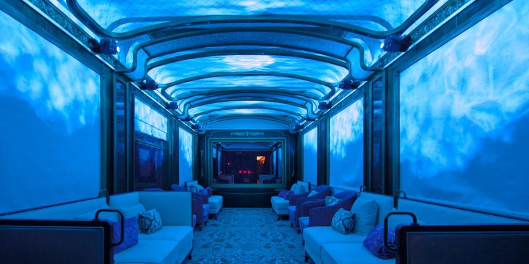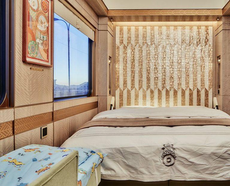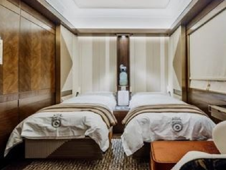 星享宮客廳車 – 創新採用雙開門上車形式,靈感源自漢代馬車的車廂形體與細節。車內空間寬敞,旨在打造一個理想的社交場景。頂級鋼琴品牌博蘭斯勒(Blüthner)的產品與匠心獨具的設計讓古典韻味與現代風格完美融合。藝術孤品與古董銀器穿越歷史長河來到賓客面前,與現代火車工藝相互輝映。