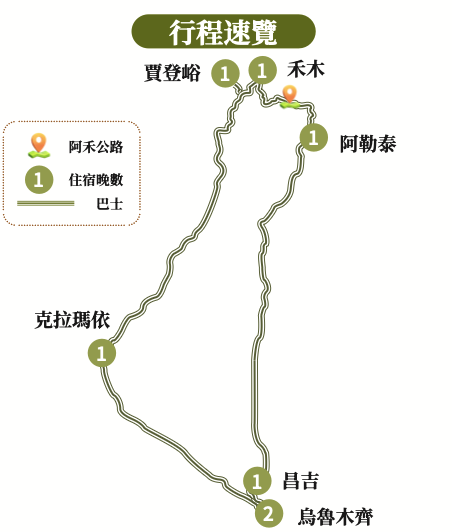 * 如偶遇阿禾公路因天氣原因臨時封路則將繞行國道前往下一站行程將臨時調整