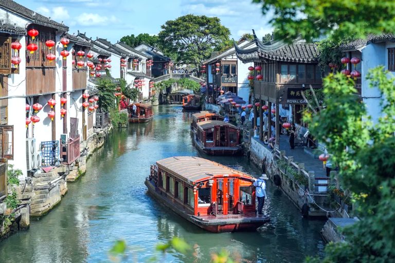 是日由翠明假期領隊陪同下搭乘客機,飛往上海/杭州/ 寧波,抵達後車赴蘇州,遊覽金雞湖欣賞夜景。