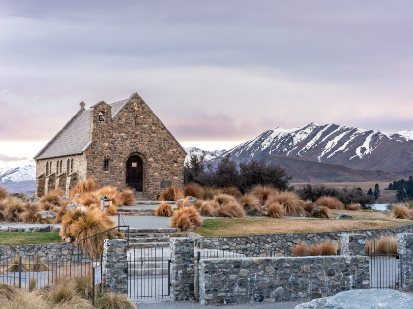 【迪加寶湖小教堂】這座漂亮的石教堂位於新西蘭的迪加寶湖岸邊,教堂以一隻牧羊犬的雕塑而命名,是對過去開創農田和當地的先驅者的一個稱頌。
