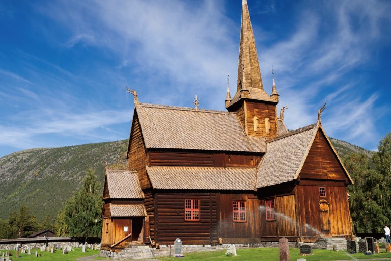 【洛姆木造教堂】建於12世紀中葉為北歐保存完好的中世紀木造教堂。三廊式結構,以獨立柱撐起主殿高層天花板;屋頂原存中世紀龍首裝飾。
