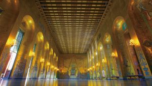 【市政廳-金殿及藍廳】每年十二月頒發的諾貝爾獎儀式結束後,都會在市政廳內的藍廳安排晚宴,晚宴後在金殿內舉行盛大的宴會。