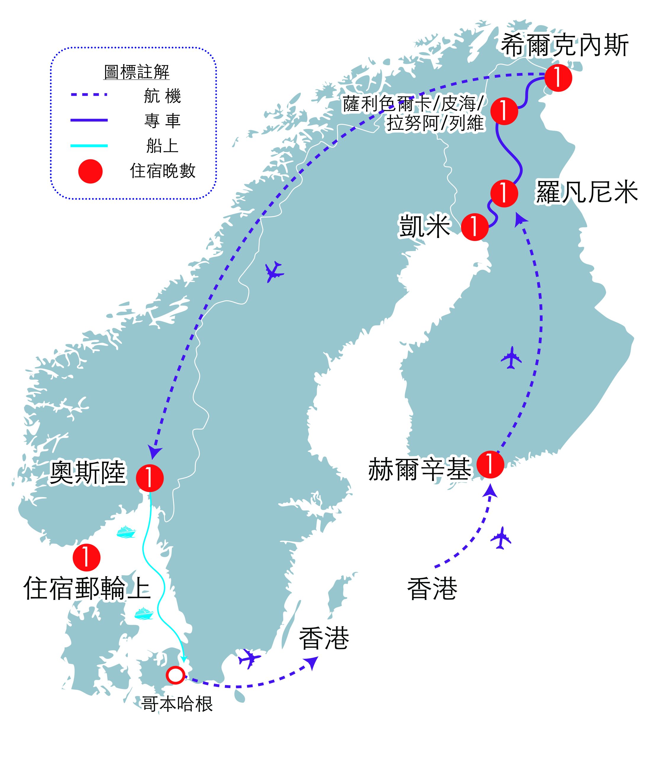 是日晚上由翠明假期領隊協助辦理一切手續後,乘坐歐洲航空公司客機經歐洲城市轉機或乘坐土耳其航空公司客機經伊斯坦堡轉機後飛往芬蘭首都赫爾辛基。