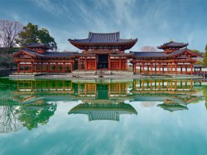 【平等院鳳凰堂】名列世界遺產之一的「平等院」,位於擁有好山好水的京都府宇治市。園內代表性建築「鳳凰堂」(原名阿彌陀堂)中,安置了一尊高約8公尺、由日本平安時代知名佛師「定朝」雕製的阿彌陀如來坐像;其周圍牆面與樑柱上更繪有色彩鮮明的天人、鳳凰、唐草等圖案,將堂內點綴得宛如極樂淨土般華麗而夢幻。