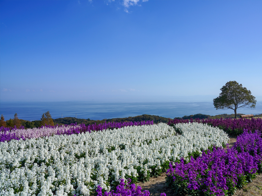 【淡路島『淡路花棧敷』】位於淡路島北部丘陵頂部,海拔由298公尺至235公尺的高原面朝大海延伸,鋪展成廣闊花田。此處可同時飽覽明石海峽與大阪灣全景,並欣賞四季輪轉所織就的鮮豔花地毯,因而被譽為「淡路花棧敷」,堪稱頂級觀景勝地。
