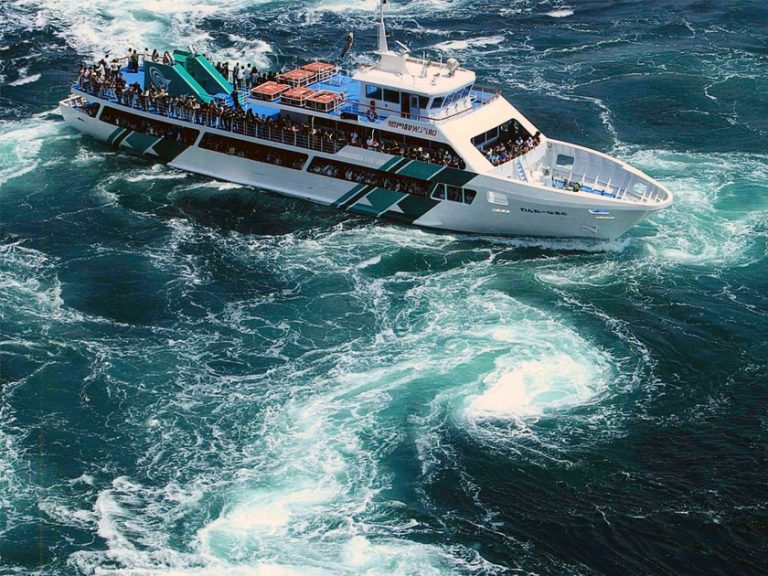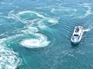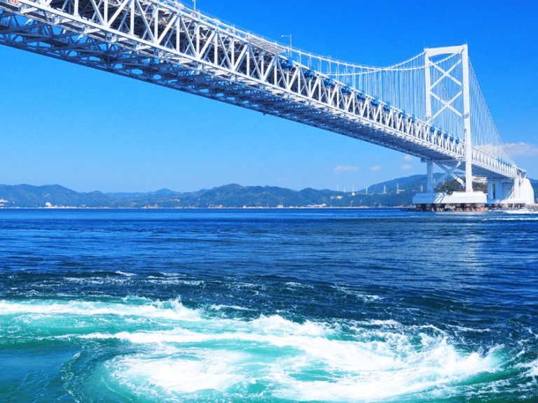 乘坐觀光船遊覽近距離觀賞世界三大漩渦 – 鳴門漩渦,直徑可達20公尺的壯觀渦流。沿途景色迷人:巍峨的大鳴門橋橫跨海峽,藍色海水翻騰,環繞四國與淡路島的翠綠山巒及海岸線,令人驚嘆自然之力。